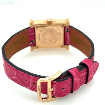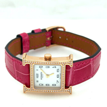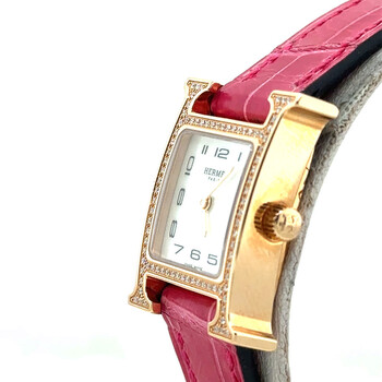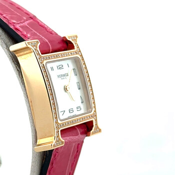 Rose gold-tone 18kt rose gold case with a pink leather strap. Fixed rose gold-tone bezel with diamond set 18kt rose gold. Mother of pearl dial with rose gold-tone hands and Arabic numeral hour markers. Dial Type: Analog. Quartz movement. Scratch resistant sapphire crystal. Pull / push crown. Solid case back. Square case shape, case size: 21 mm, case thickness: 6 mm. Band width: 14 mm. Buckle clasp. Water resistant at 30 meters / 100 feet. Functions: hour, minute. Heure H Series. Luxury watch style. Watch label: Swiss Made. Pre-owned Hermes Heure H Diamond Mother of Pearl Dial Ladies Watch HH1.173.