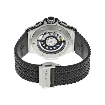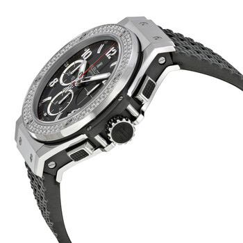 Pre-owned Stainless steel case with a black rubber (gummy) strap. Fixed stainless steel bezel set with diamond and featuring screw down accents. Black dial with luminous hands and alternating Arabic numeral and index hour markers. Minute markers around the outer rim. Dial Type: Analog. Luminescent hands and markers. Date display between the 4 and 5 o'clock positions. Chronograph - three sub-dials displaying: 60 second, 30 minute and 12 hour. Hublot calibre HUB2894 automatic movement with a 42-hour power reserve. Scratch resistant sapphire crystal. Pull / push crown. Skeleton case back. Case size: 41 mm. Case thickness: 14mm. Round case shape. Band width: 24 mm. Band length: 8 inches. Deployment clasp. Water resistant at 100 meters / 330 feet. Functions: chronograph, date, hour, minute, second. Luxury watch style. Watch label: Swiss Made. Item Variations: 341SX130RX114. Hublot Big Bang Black Dial Black Rubber Men's Watch 341.SX.130.RX.114.