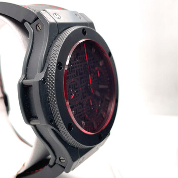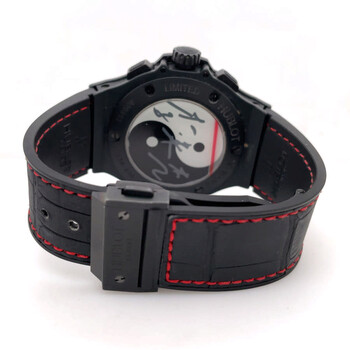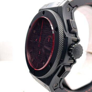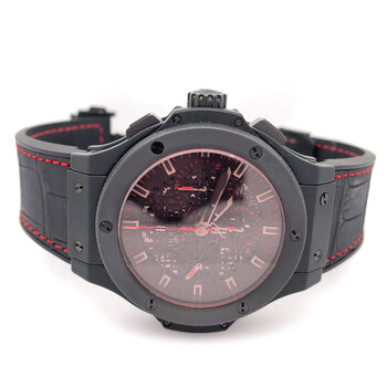 Black ceramic case with a black leather strap. Fixed black ceramic bezel. Transparent dial with black hands and index hour markers. Minute markers around the outer rim. Dial Type: Analog. Date display between 4 and 5 o'clock position. Chronograph - three sub-dials displaying: 60 second, 30 minute and 12 hour. Automatic movement. Scratch resistant sapphire crystal. Pull / push crown. Solid case back. Round case shape, case size: 44 mm, case thickness: 15 mm. Band width: 24 mm. Deployment with push button release clasp. Water resistant at 100 meters / 330 feet. Functions: chronograph, date, hour, minute, second. Big Bang Aero Bang Series. Luxury watch style. Watch label: Swiss Made. Pre-owned Hublot Big Bang Aero Bang Chronograph Automatic Men's Watch 311.CI.1130.GR.JLI11.