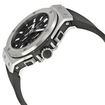 Silver-tone stainless steel with lateral black kevlar case with a black rubber strap. Fixed silver-tone stainless steel with titanium screws bezel. Black dial with luminous silver-tone skeleton hands and index hour markers. Minute markers around the outer rim. Dial Type: Analog. Luminescent hands and markers. Date display between 4 and 5 o'clock position. Chronograph - three sub-dials displaying: 60 second, 30 minute and 12 hour. Hublot Calibre HUB4100 Automatic movement, based upon ETA 2894-2, containing 27 Jewels, composed of 252 parts, bitting at 28800 vph, and has a power reserve of approximately 42 hours. Scratch resistant sapphire crystal. Pull / push crown. Transparent case back. Round case shape, case size: 44 mm, case thickness: 14.5 mm. Band width: 25 mm. Deployment clasp. Water resistant at 100 meters / 330 feet. Functions: chronograph, date, hour, minute, second. Big Bang Series. Sport watch style. Watch label: Swiss Made. Pre-owned Hublot Big Bang Chronograph Automatic Black Dial Men's Watch 301.SX.1170.RX.