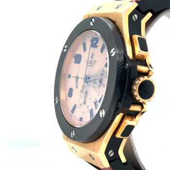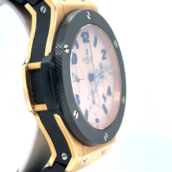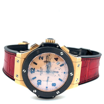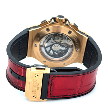 Rose gold-tone 18kt rose gold case with a red leather strap. Fixed black bezel. Matt gold (satinfinish) dial with skeleton hands and alternating Arabic numeral and index hour markers. Minute markers around the outer rim. Dial Type: Analog. Date display between the 4 and 5 o'clock positions. Chronograph - three sub-dials displaying: 60 second, 30 minute and 12 hour. Hublot Calibre HUB44 Automatic movement, based upon ETA Valjoux 7750, containing 25 Jewels, composed of 252 parts, bitting at 28800 vph, and has a power reserve of approximately 42 hours. Scratch resistant sapphire crystal. Pull / push crown. Transparent case back. Round case shape, case size: 44 mm, case thickness: 14.5 mm. Band width: 22 mm. Deployment with push button release clasp. Water resistant at 100 meters / 330 feet. Functions: chronograph, date, hour, minute, second. Additional Info: chronograph; date displays between 4 and 5 o'clock positions. Big Bang Series. Luxury watch style. Watch label: Swiss Made. Item Variations: 301.PI.500.RX, 301-PI-500-RX, 301/PI/500/RX, 301PI500RX. Pre-owned Hublot Big Bang Chronograph Automatic Men's Watch 301.PI.500.RX.