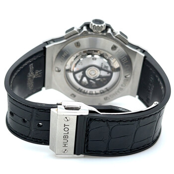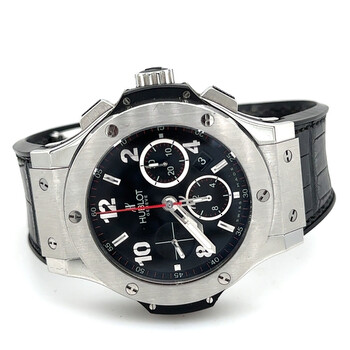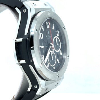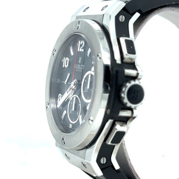 Pre-owned Stainless steel case with lateral black Kevlar inserts and a black rubber strap. Fixed stainless steel bezel. Black dial with lumious silver-tone skeleton hands and alternating Arabic numeral and index hour markers. Minute markers around outter rim. Dial Type: Analog. Luminescent hands and markers. Date display between the 4 and 5 o'clock positions. Chronograph - three sub-dials displaying: 12 hours, 30 minutes, small seconds. Hublot calibre HUB4100 automatic movement, based upon ETA 2894-2, containing 27 Jewels, composed of 252 parts, bitting at 28800 vph, and has a power reserve of approximately 42 hours. Scratch resistant sapphire crystal. Pull / push crown. Transparent case back. Round case shape. Case size: 44 mm. Case thickness: 14.5 mm. Band width: 25 mm. Band length: 8.5 inches. Deployment clasp. Water resistant at 100 meters / 330 feet. Functions: chronograph, date, hour, minute, second. Dress watch style. Watch label: Swiss Made. Item Variations: 301.SX.130.RX, 301-SX-130-RX, 301/SX/130/RX, 301SX130RX. Hublot Big Bang Automatic 44mm Men's Watch 301.SX.130.RX.