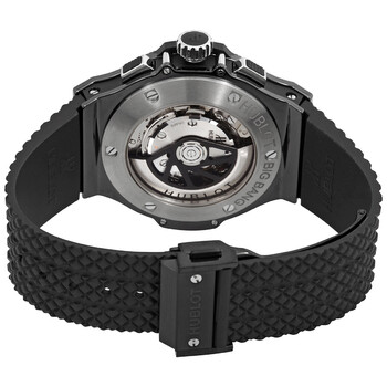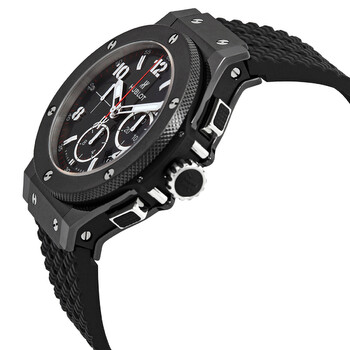 Pre-owned Black ceramic case with a black rubber strap. Fixed black ceramic bezel. Carbon fiber dial with luminous silver-tone skeleton hands and alternating index and Arabic numeral hour markers. Arabic numeral minute markers (at 5 minute intervals). Minute markers around the outer rim. Dial Type: Analog. Luminescent hands and markers. Date display between the 4 and 5 o'clock positions. Chronograph - three sub-dials displaying: 60 second, 30 minute and 12 hour. Hublot calibre HUB4100 automatic movement, based upon ETA 2894-2, containing 27 Jewels, composed of 252 parts, bitting at 28800 vph, and has a power reserve of approximately 42 hours. Scratch resistant sapphire crystal. Pull / push crown. Transparent case back. Round case shape. Case size: 44 mm. Case thickness: 14.5 mm. Deployant clasp. Water resistant at 100 meters / 330 feet. Functions: chronograph, date, hour, minute, second. Big Bang Series. Luxury watch style. Watch label: Swiss Made. Hublot Big Bang Chronograph Automatic Carbon Fiber Dial Men's Watch 301.CM.130.RX.