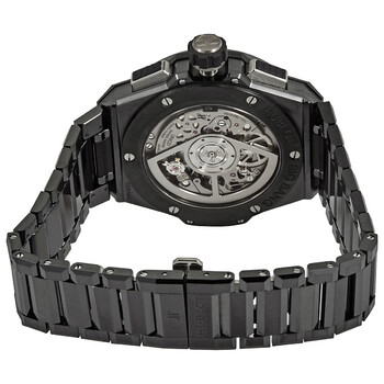 Pre-owned Black ceramic case with a black ceramic bracelet. Fixed black ceramic bezel. Skeleton dial with luminous silver-tone hands and index hour markers. Arabic numeral minute markers (at 5 minute intervals). Minute markers around the outer rim. Dial Type: Analog. Luminescent hands and markers. Date display at the 3 o'clock position. Chronograph - two sub-dials displaying: 60 second and 6 0 minute. Hublot calibre HUB1280 automatic movement, containing 43 Jewels, composed of 354 parts, bitting at 28800 vph, and has a power reserve of approximately 72 hours. Scratch resistant sapphire crystal. Screw down crown. Transparent case back. Round case shape. Case size: 42 mm. Case thickness: 14.5 mm. Fold over clasp with a push button release. Water resistant at 100 meters / 330 feet. Functions: chronograph, date, hour, minute, second. Big Bang Integral Series. Luxury watch style. Watch label: Swiss Made. Hublot Big Bang Integral Chronograph Automatic Men's Watch 451.cx.1170.cx.