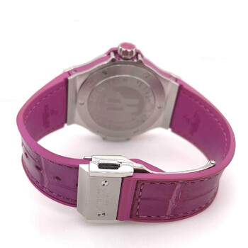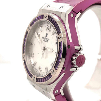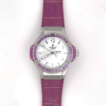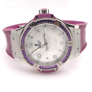 Pre-owned Stainless steel case with a purple alligator rubber bracelet. White gold set with 48 amethyst baguettes bezel. Mother of pearl dial with silver-tone hands and index and Arabic hour markers. Minute markers around the outer rim. Dial Type: analog. Luminescent hands. Swiss quartz movement. Scratch resistant sapphire crystal - scratch resistant crystal. Steel crown. Case diameter: 38 mm. Case thickness: 12 mm. Steel clasp. Water resistant at 100m/330ft. Luxury watch style. Hublot Big Bang Mother of Pearl Dial 48 Amethyst Baguettes Purple Rubber Unisex Watch 361.SV.6010.LR.1905.