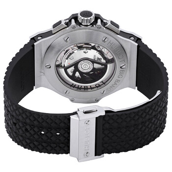 Silver-tone stainless steel case with a black rubber strap. Fixed black ceramic bezel. Black carbon fiber pattern dial with luminous skeleton hands and alternating Arabic numeral and index hour markers. Minute markers around the outer rim. Dial Type: Analog. Luminescent hands and markers. Date display between 4 and 5 o'clock position. Chronograph - three sub-dials displaying: 60 second, 30 minute and 12 hour. Hublot Calibre HUB4100 Automatic movement, based upon ETA 2894-2, containing 27 Jewels, composed of 252 parts, bitting at 28800 vph, and has a power reserve of approximately 42 hours. Scratch resistant sapphire crystal. Pull / push crown. Transparent case back. Round case shape, case size: 44 mm, case thickness: 14.5 mm. Band width: 25 mm. Fold over clasp with a push button release. Water resistant at 100 meters / 330 feet. Functions: chronograph, date, hour, minute, second. Big Bang Steel Ceramic Series. Sport watch style. Watch label: Swiss Made. Pre-owned Hublot Big Bang Steel Ceramic Chronograph Automatic Men's Watch 301.SB.131.RX.