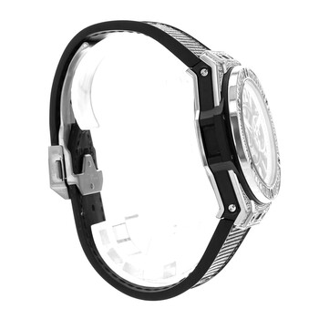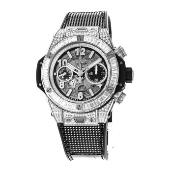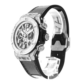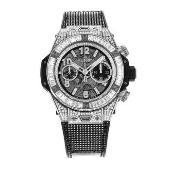Titanium set with 162 diamonds for 1.1 cts case with a black rubber strap. Fixed 18kt white gold set with 48 baguette-cut diamonds bezel. Black dial with silver-tone hands and Roman numeral hour markers. Dial Type: Analog. Luminescent hands. Chronograph - two sub-dials displaying: 60 minute and 60 second. Hublot Calibre HUB1280 Automatic movement, containing 43 Jewels, composed of 354 parts, bitting at 28800 vph, and has a power reserve of approximately 72 hours. Scratch resistant sapphire crystal. Screw down crown. Transparent see through case back. Round case shape, case size: 44 mm. Deployment with push button release clasp. Water resistant at 100 meters / 330 feet. Functions: chronograph, column wheel, hour, minute, second. Big Bang Unico Series. Luxury watch style. Watch label: Swiss Made. Pre-owned Hublot Big Bang Unico Chronograph Automatic Diamond Black Dial Men's Watch 421.NX.1170.RX.0904.