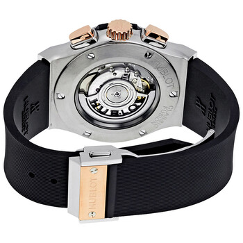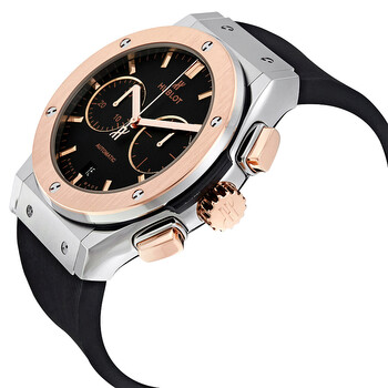 Pre-owned Grey titanium case with a black rubber strap. Fixed 18kt rose gold bezel. Black dial with rose gold hands and index hour markers. Minute markers around the outer rim. Dial Type: Analog. Date display at the 6 o'clock position. Chronograph - two sub-dials displaying: 60 second and 30 minute. Hublot calibre HUB1143 automatic movement, based upon ETA 2892-A2, containing 59 Jewels, bitting at 28800 vph, and has a power reserve of approximately 42 hours. Scratch resistant sapphire crystal. Pull / push crown. Transparent case back. Round case shape. Case size: 45 mm. Deployment clasp. Water resistant at 50 meters / 165 feet. Functions: chronograph, date, hour, minute, second. Classic Fusion Series. Luxury watch style. Watch label: Swiss Made. Hublot Classic Fusion Automatic Chronograph Men's Watch 521.NO.1181.RX.