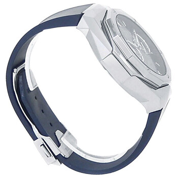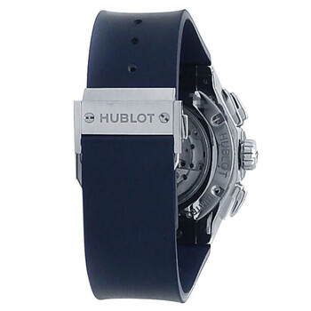 Pre-owned Grey titanium case with a blue rubber strap. Fixed grey titanium bezel. Blue (cut-out) dial with silver-tone hands and index hour markers. Minute markers around the outer rim. Dial Type: Analog. Date display at the 6 o'clock position. Chronograph - two sub-dials displaying: 60 second and 30 minute. Hublot calibre HUB1155 automatic movement, based upon ETA 2892, containing 60 Jewels, composed of 207 parts, bitting at 28800 vph, and has a power reserve of approximately 42 hours. Scratch resistant sapphire crystal. Transparent see through case back. Round case shape. Case size: 45 mm. Deployment clasp with a push button release. Water resistant at 50 meters / 165 feet. Functions: chronograph, date, hour, minute, second. Additional Info: original box, international warranty card, manual (complete accessories). Classic Fusion Series. Luxury watch style. Watch label: Swiss Made. Hublot Classic Fusion Chronograph Automatic Men's Watch 525.NX.5170.RX.ORL21.