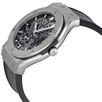 Pre-owned Titanium case with a black alligator leather strap. Fixed titanium bezel. Skeleton dial with silver-tone hands and index hour markers. Dial Type: Analog. Small second sub-dial at the 7 o'clock position subdials. Hublot Calibre HUB1300.4 hand wind movement with a 90-hour power reserve. Scratch resistant sapphire crystal. Pull / push crown. Skeleton case back. Round case shape. Case size: 42 mm. Band width: 20.3 mm, band length: 8 inches. Fold over with push button release clasp. Water resistant at 50 meters / 165 feet. Functions: hour, minute, second. Casual watch style. Watch label: Swiss Made. Item Variations: 545 NX 0170 LR, 545-NX-0170-LR, 545/NX/0170/LR, 545NX0170LR. Hublot Classic Fusion Hand Wind Skeleton Dial Men's Watch 545.NX.0170.LR.