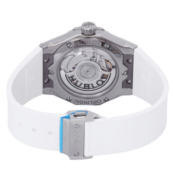 Grey titanium case with a white rubber strap. Fixed grey titanium bezel. White dial with silver-tone hands and index hour markers. Dial Type: Analog. Hublot Calibre HUB1100 Automatic movement, based upon Sellita SW300-1, containing 25 Jewels, composed of 63 parts, bitting at 28800 vph, and has a power reserve of approximately 42 hours. Scratch resistant sapphire crystal. Transparent see through case back. Dodecagon case shape, case size: 40 mm. Deployment with push button release clasp. Water resistant at 50 meters / 165 feet. Functions: hour, minute, second. Classic Fusion Series. Luxury watch style. Watch label: Swiss Made. Pre-owned Hublot Classic Fusion White Dial Men's Watch 550.NS.2200.RW.ORL20.
