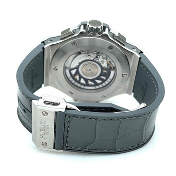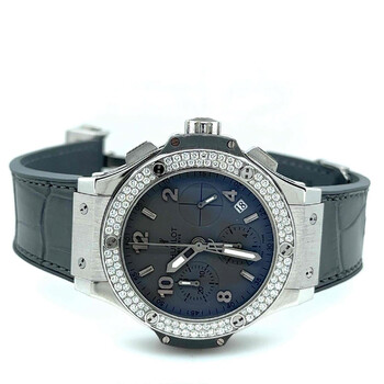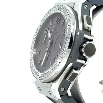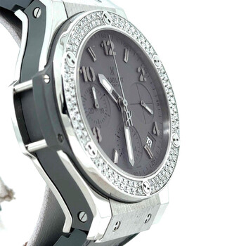 Pre-owned Stainless steel case with a alligator rubber bracelet. Set with diamonds bezel. Grey dial with silver-tone hands and index and Arabic hour markers. Minute markers around the outer rim. Dial Type: analog. Luminescent hands and markers. Date display between the 4 and 5 o'clock position. 12 hours, 30 minutes and 1/4th of a second. Automatic movement. Scratch resistant sapphire crystal. Stainless steel crown. Case diameter: 41 mm. Deployment clasp. Water resistant at 100 meters / 330 feet. Functions: chronograph, date, hour, minute, second. Luxury watch style. Hublot Earl Grey Automatic Chronograph Alligator Rubber Men's Watch 342.ST.5010.LR.1104.
