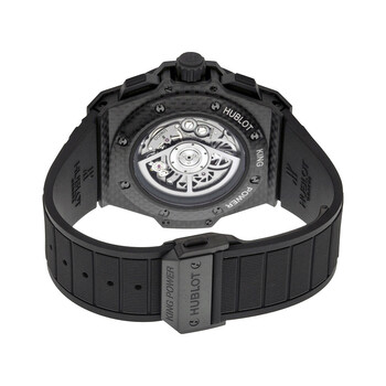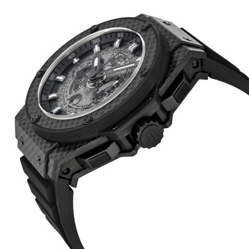 Pre-owned Carbon fiber case with a black rubber strap. Fixed carbon fiber bezel. Skeletonized dial with luminous hands and index hour markers. Minute markers around the outer rim. Dial Type: Analog. Luminescent hands and markers. Date display between the 4 and 5 o'clock positions. Chronograph - two sub-dials displaying: 60 second and 60 minute. Automatic movement with a 72 hour power reserve. Scratch resistant sapphire crystal. Pull / push crown. Skeleton case back. Case diameter: 48 mm. Case thickness: 17.60 mm. Round case shape. Band width: 20.3 mm. Band length: 8 inches. Deployment clasp. Water resistant at 100 meters / 330 feet. Functions: chronograph, date, hour, minute, second. Luxury watch style. Watch label: Swiss Made. Hublot King Power Unico Skeleton Dial Automatic Carbon Fiber Rubber Men's Watch 701QX0140RX.