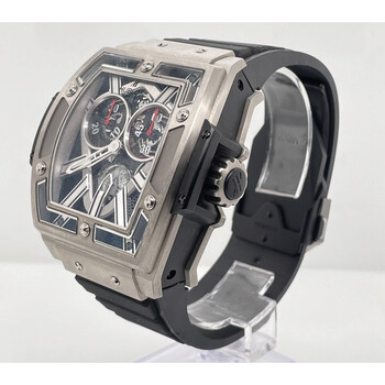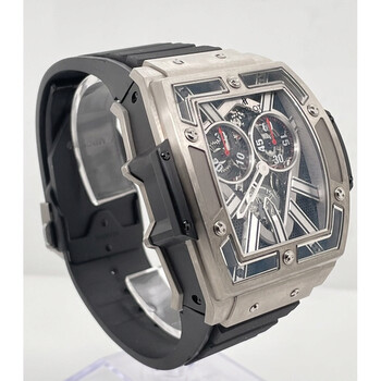 Grey titanium case with a black rubber strap. Fixed grey titanium bezel. Black dial with silver-tone hands and index hour markers. Dial Type: Analog. Luminescent hands and markers. Hublot Calibre HUB5100 automatic movement with a 240-hour power reserve. Scratch resistant sapphire crystal. Transparent see through case back. Tonneau case shape, case size: 48 mm. Deployment with push button release clasp. Water resistant at 100 meters / 330 feet. Functions: chronograph, hour, minute, second. Additional Info: limited to only 10pcs. Masterpiece Mp 01 Series. Luxury watch style. Watch label: Swiss Made. Pre-owned Hublot Masterpiece MP 01 Chronograph Automatic Black Dial Men's Watch 901.NX.0129.RX.