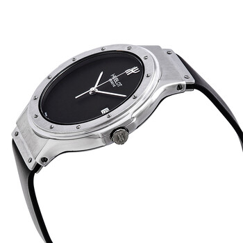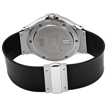 Silver-tone stainless steel case with a black rubber strap. Fixed silver-tone stainless steel bezel. Black dial with silver-tone hands. Dial Type: Analog. Date display at the 3 o'clock position. Quartz movement. Scratch resistant sapphire crystal. Pull / push crown. Solid case back. Round case shape, case size: 36 mm, case thickness: 7 mm. Fold over clasp. Water resistant at 50 meters / 165 feet. Functions: date, hour, minute, second. Luxury watch style. Watch label: Swiss Made. Pre-owned Hublot MDM Classic Quartz Black Dial Watch 1523.1.