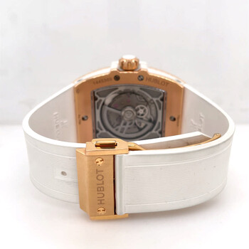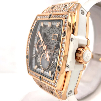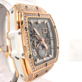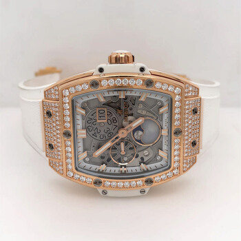 Pre-owned 18k king gold set with 156 diamonds for 0.89ct case with a white alligator leather strap. Fixed 48 diamonds for 0.58ct bezel. Silver-tone dial with silver-tone hands and index hour markers. Minute markers around the outer rim. Dial Type: Analog. Luminescent hands and markers. Date display at the 1 o'clock position. Three - moonphase, smal second, big date subdials. Hublot Calibre HUB1770 automatic movement with a 50-hour power reserve. Scratch resistant sapphire crystal. Transparent case back. Case size: 42 mm. Tonneau case shape. Deployant buckle clasp. Water resistant at 100 meters / 330 feet. Functions: moon phase, big date, hour, minute. Luxury watch style. Watch label: Swiss Made. Hublot Spirit of Big Bang Moonphase Diamond Watch 647.OE.2080.RW.1604.