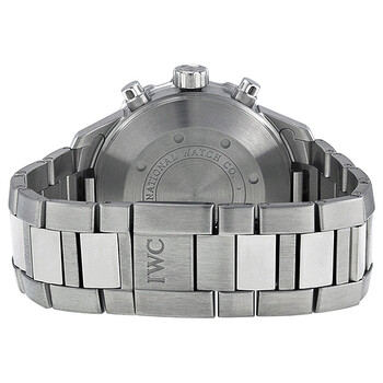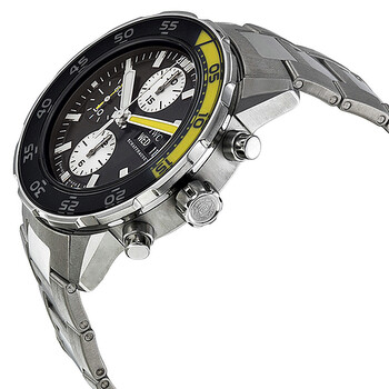 Silver-tone stainless steel case with a silver-tone stainless steel bracelet. Uni-directional rotating black and yellow stainless steel bezel. Black dial with silver-tone hands and index hour markers. Minute markers around the outer rim. Dial Type: Analog. Luminescent hands and markers. Automatic day/date at the 3 o'clock position. Chronograph - sub-dials displaying: 60-second, 30-minute, 12-hour. IWC Calibre 79320 automatic movement. Scratch resistant mineral crystal. Stainless steel crown. Solid case back. Round case shape, case size: 44 mm, case thickness: 15 mm. Deployment clasp. Water resistant at 120 meters / 400 feet. Functions: chronograph, date, day, hour, minute, small second. Sport watch style. Watch label: Swiss Made. Pre-owned IWC Aquatimer Chronograph Automatic Black Dial Men's Watch IW376701.
