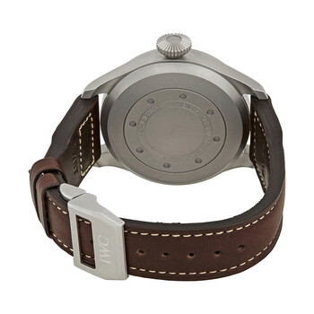 Grey titanium case with a brown calfskin leather strap. Fixed grey titanium bezel. Black dial with luminous blue hands and Arabic numeral hour markers. Minute markers around the outer rim. Dial Type: Analog. Luminescent hands and markers. Date display at the 6 o'clock position. One subdial displaying: power reserve indicator. IWC Calibre 52110 Automatic movement, based upon IWC 52010, containing 31 Jewels, composed of 257 parts, bitting at 28800 vph, and has a power reserve of approximately 168 hours. Scratch resistant sapphire crystal. Screw down crown. Solid case back. Round case shape, case size: 46.2 mm, case thickness: 15.4 mm. Tang clasp. Water resistant at 60 meters / 200 feet. Functions: date, hour, minute, second, power reserve. Big Pilots Series. Pilot watch style. Watch label: Swiss Made. Pre-owned IWC Big Pilots Automatic Black Dial Men's Watch IW501004.