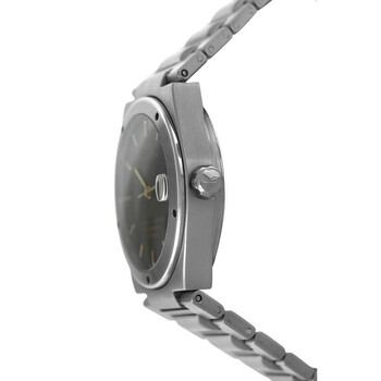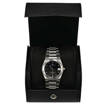 Silver-tone stainless steel case and bracelet. Fixed silver-tone stainless steel bezel. Black dial with yellow gold-tone hands and index hour markers. Minute markers around the outer rim. Dial Type: Analog. Date display at the 3 o'clock position. Automatic movement. Solid case back. Round case shape, case size: 34 mm. Fold over clasp with a safety release. Functions: date, hour, minute, second. Ingenieur Series. Luxury watch style. Watch label: Swiss Made. Pre-owned IWC Ingenieur Automatic Black Dial Men's Watch IW352102.