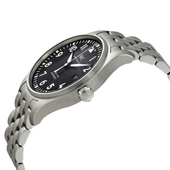 Stainless steel case with a stainless steel bracelet. Fixed stainless steel bezel. Black dial with luminous black hands and Arabic numeral hour markers. Minute markers around the outer rim. Dial Type: Analog. Luminescent hands and markers. Date display at the 3 o'clock position. IWC calibre 35111 automatic movement, based upon Sellita SW300-1, containing 25 Jewels, composed of 163 parts, bitting at 28800 vph, and has a power reserve of approximately 42 hours. Scratch resistant sapphire crystal. Screw down crown. Solid case back. Round case shape. Case size: 40 mm. Case thickness: 11 mm. Band width: 20 mm. Deployment clasp with a push button release. Water resistant at 60 meters / 200 feet. Functions: date, hour, minute, second. Pilot's Mark Xvii Series. Luxury watch style. Watch label: Swiss Made. IWC Mark XVIII Black Dial Automatic Stainless Steel Men's Watch IW327015.