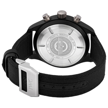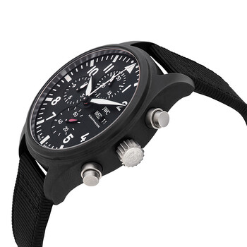 Black ceramic case with a black NATO textile strap. Fixed black ceramic bezel. Black dial with luminous black hands and Arabic numeral hour markers. Minute markers around the outer rim. Dial Type: Analog. Luminescent hands and markers. Day of the week and date display at the 3 o'clock position. Chronograph - three sub-dials displaying: 60 second, 30 minute and 12 hour. IWC Calibre 69380 Automatic movement, based upon WC 69370, containing 33 Jewels, bitting at 28800 vph, and has a power reserve of approximately 48 hours. Scratch resistant sapphire crystal. Screw down crown. Solid case back. Round case shape, case size: 44.5 mm, case thickness: 15.7 mm. Band width: 21 mm. Tang clasp. Water resistant at 60 meters / 200 feet. Functions: chronograph, day, date, hour, minute, second. Pilot Top Gun Series. Pilot watch style. Watch label: Swiss Made. Pre-owned IWC Pilot Top Gun Chronograph Automatic Black Dial Men's Watch IW389101.