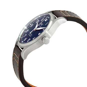 Silver-tone stainless steel case with a brown santoni calfskin leather strap. Fixed silver-tone stainless steel bezel. Midnight blue dial with luminous silver-tone hands and Arabic numeral hour markers. Minute markers around the outer rim. Dial Type: Analog. Luminescent hands and markers. Date display at the 3 o'clock position. IWC Calibre 30110 Automatic movement, based upon ETA 2892-A2, containing 21 Jewels, bitting at 28800 vph, and has a power reserve of approximately 42 hours. Scratch resistant sapphire crystal. Screw down crown. Solid case back. Round case shape, case size: 40 mm, case thickness: 11 mm. Tang clasp. Water resistant at 60 meters / 200 feet. Functions: date, hour, minute, second. Additional Info: special edition. Pilot's Mark Xviii Series. Pilot watch style. Watch label: Swiss Made. Pre-owned IWC Pilots Mark XVIII Automatic Men's Watch IW327004.