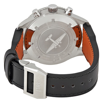 Silver-tone stainless steel case with a black embossed leather strap. Bi-directional rotating black bezel. Black dial with black hands and Arabic numeral hour markers. Minute markers around the outer rim. Dial Type: Analog. Luminescent hands and markers. Date display at the 6 o'clock position. Chronograph - two sub-dials displaying: 60 second and combined 12 hour with 60 minute. IWC Calibre 89760 Automatic movement, containing 39 Jewels, bitting at 28800 vph, and has a power reserve of approximately 68 hours. Scratch resistant sapphire crystal. Screw down crown. Solid case back. Round case shape, case size: 45 mm, case thickness: 16.5 mm. Deployment clasp. Water resistant at 60 meters / 200 feet. Functions: GMT, second time zone, hour, minute, second, date. Pilot's Timezoner Series. Pilot watch style. Watch label: Swiss Made. Pre-owned IWC Pilots Timezoner Automatic Black Dial Men's Watch IW395001.