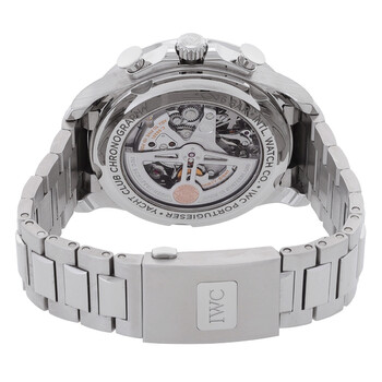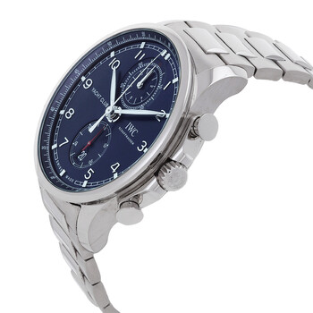 Silver-tone stainless steel case and bracelet. Fixed silver-tone stainless steel bezel. Blue dial with luminous silver-tone hands and Arabic numeral hour markers. Arabic numeral minute markers (at 5 minute intervals). Minute markers around the outer rim. Dial Type: Analog. Luminescent hands. Date display above the 6 o'clock position. Chronograph - two sub-dials displaying: 60 second and 60 minute. IWC Calibre 89361 Automatic movement, based upon IWC 89360, containing 38 Jewels, and has a power reserve of approximately 68 hours. Scratch resistant sapphire crystal. Screw down crown. Transparent case back. Round case shape, case size: 44.6 mm, case thickness: 14.3 mm. Band width: 22 mm, band length: 7 inches. Deployment clasp. Water resistant at 60 meters / 200 feet. Functions: chronograph, flyback, date, hour, minute, small second. Portugieser Series. Luxury watch style. Watch label: Swiss Made. Pre-owned IWC Portugieser Chronograph Automatic Blue Dial Men's Watch IW390701.