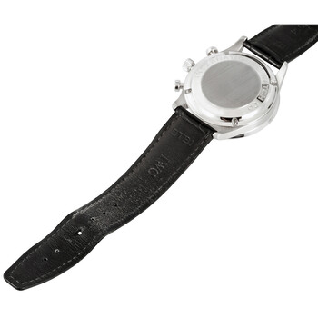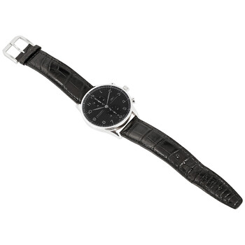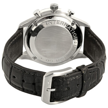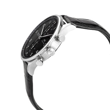 Silver-tone stainless steel case with a black alligator leather strap. Fixed silver-tone stainless steel bezel. Black dial with silver-tone leaf-style shape hands and Arabic numeral hour markers. Minute markers around the outer rim. Dial Type: Analog. Chronograph - two sub-dials displaying: 30 minutes and 60 seconds. IWC Calibre 79350 Automatic movement, based upon ETA 7750, containing 31 Jewels, bitting at 28800 vph, and has a power reserve of approximately 44 hours. Scratch resistant sapphire crystal. Pull / push crown. Solid case back. Round case shape, case size: 40.9 mm, case thickness: 12.3 mm. Band width: 22 mm. Deployment clasp. Water resistant at 30 meters / 100 feet. Functions: chronograph, hour, minute, second. Portuguese Series. Luxury watch style. Watch label: Swiss Made. Pre-owned IWC Portuguese Chronograph Automatic Black Dial Men's Watch IW371447.