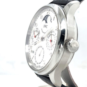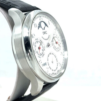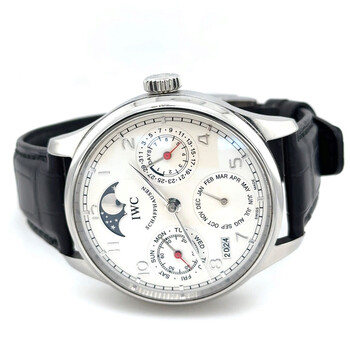 Silver-tone stainless steel case with a black leather strap. Fixed stainless stee silver-tone stainless steel bezel. Silver dial with silver-toned hands and Arabic hour markers. Minute markers around the outer rim. Dial Type: Analog. Perpetual calendar. Four sub-dials displaying: moonphase, day of the week (60 second), month and date (power reserve). IWC Calibre 51613 Automatic movement, based upon IWC 51610, containing 62 Jewels, bitting at 21600 vph, and has a power reserve of approximately 168 hours. Scratch resistant sapphire crystal. Pull / push crown. Skeleton case back. Round case shape, case size: 44.2 mm, case thickness: 15.3 mm. Band width: 20 mm. Deployment with push button release clasp. Water resistant at 30 meters / 100 feet. Functions: perpetual calendar, moon phase, year, month, date, day, hour, minute, small second, power reserve indicator. Portuguese Perpetual Calendar Series. Luxury watch style. Watch label: Swiss Made. Pre-owned IWC Portuguese Perpetual Calendar Silver Dial Men's Watch IW502308.