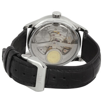 Pre-owned Stainless steel case with a black croco-embossed leather strap. Fixed stainless steel bezel. White dial with rose gold hands and rose gold Arabic numerals hour markers. Minute markers around the outer rim. Date display at the 6 o'clock position. Two sub-dials displaying: 60 seconds and power reserve indicator. Automatic movement. Scratch resistant anti-reflective sapphire crystal. Skeletal case back. Case diameter: 42.3 mm. Case thickness: 14 mm. Tang clasp. Water resistant at 30 meters / 100 feet. AdditionalInfo: 7 day power reserve. IWC Portuguese Automatic Men's Watch 5001-14.