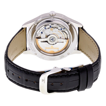 Silver-tone stainless steel case with a alligator leather strap. Fixed silver-tone stainless steel bezel. Silver-tone dial with silver-tone hands and index hour markers. Arabic numerals mark the 3, 9 and 12 o'clock positions. date scale around the outer rim. Dial Type: Analog. Day of the week and month display below the 12 o'clock position. One subdial displaying: small second and moonphase at the 6 o'clock position. Jaeger LeCoultre Calibre JLC 866 Automatic movement, containing 32 Jewels, composed of 305 parts, bitting at 28800 vph, and has a power reserve of approximately 43 hours. Scratch resistant sapphire crystal. Pull / push crown. Skeleton case back. Round case shape, case size: 39 mm, case thickness: 10.6 mm. Fold over with safety release clasp. Water resistant at 50 meters / 165 feet. Functions: full calendar, moon phase, month, date, day, hour, minute, small second. Master Calendar Series. Luxury watch style. Watch label: Swiss Made. Pre-Owned Jaeger LeCoultre Master Calendar Automatic Men's Watch Q1558420. Box: Yes ,Paper: No