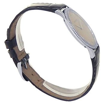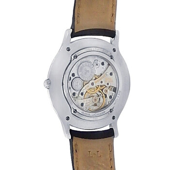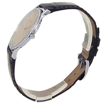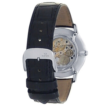 Silver-tone stainless steel case with a black leather strap. Fixed silver-tone bezel with diamond set stainless steel. Ivory dial with silver-tone hands and stick hour markers. Arabic numerals mark the 3, 6, 9 and 12 o'clock positions. Dial Type: Analog. Hand wind movement. Scratch resistant sapphire crystal. Transparent see through case back. Round case shape, case size: 34 mm. Buckle clasp. Water resistant at 30 meters / 100 feet. Functions: hour, minute. Master Ultra Thin Series. Luxury watch style. Watch label: Swiss Made. Pre-owned Jaeger LeCoultre Master Ultra Thin Ivory Dial Men's Watch Q1458401.