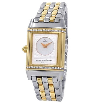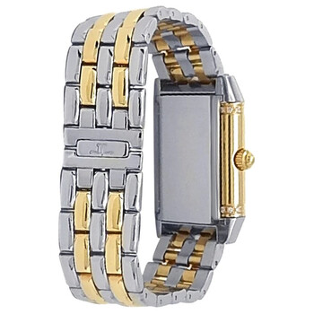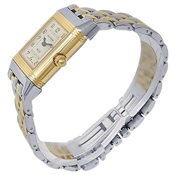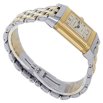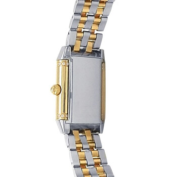 Pre-owned 18kt yellow gold and stainless steel case with a two-tone (silver-tone and yellow gold-tone) 18kt yellow gold and stainless steel bracelet. Fixed 18kt yellow gold bezel. Silver dial with blue-toned hands and Arabic hour markers. Minute markers around the outer rim. Dial Type: Analog. Automatic movement. Scratch resistant sapphire crystal. Pull / push crown. Rectangle case shape. Case size: 33.2 mm x 20.7 mm. Deployment clasp. Water resistant at 30 meters / 100 feet. Functions: hour, minute. Luxury watch style. Watch label: Swiss Made. Item Variations: Q266511F, 266511F, 266.51.1F, Q266.51.1F. Jaeger LeCoultre Reverso Duetto 18kt Yellow Gold Stainless Steel Ladies Watch Q266511F.