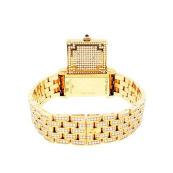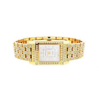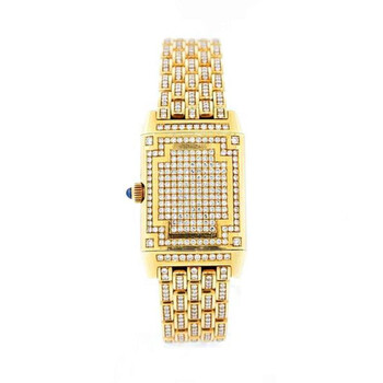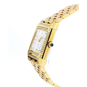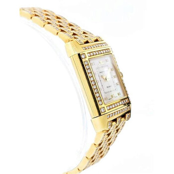 Yellow gold-tone diamond set 18kt yellow gold case and bracelet. Fixed yellow gold-tone bezel with diamond set 18kt yellow gold. Mother of pearl dial with yellow gold-tone hands and diamond hour markers. Minute scale around the inner rim. Dial Type: Analog. Hand wind movement. Scratch resistant sapphire crystal. Pull / push crown. Solid case back. Rectangle case shape, case size: 21 mm. Band width: 14 mm, band length: 7 inches. Buckle clasp. Water resistant at 50 meters / 165 feet. Functions: hour, minute. Reverso Series. Luxury watch style. Watch label: Swiss Made. Pre-owned Jaeger LeCoultre Reverso Hand Wind Diamond Ladies Watch 267.1.86.