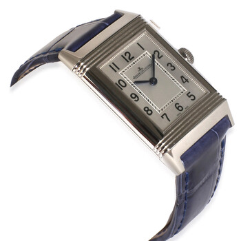 Silver-tone stainless steel case with a blue alligator band. Fixed silver-tone stainless steel bezel. Silver-tone dial with blue hands and Arabic numeral hour markers. Minute scale around the inner rim. Dial Type: Analog. Jaeger LeCoultre Calibre JLC 657 quartz movement. Scratch resistant sapphire crystal. Solid case back. Rectangle case shape, case size: 40.1 x 24.4 mm, case thickness: 7.40 mm. Band width: 18 mm, band length: 7.50 inches. Buckle clasp. Water resistant at 30 meters / 100 feet. Functions: hour, minute. Additional Info: includes box, papers, instructions. Reverso Series. Sport watch style. Watch label: Swiss Made. Item Variations: 222.8.47. Pre-owned Jaeger LeCoultre Reverso Quartz Silver Dial Unisex Watch Q2518540.