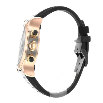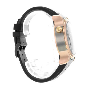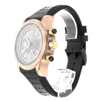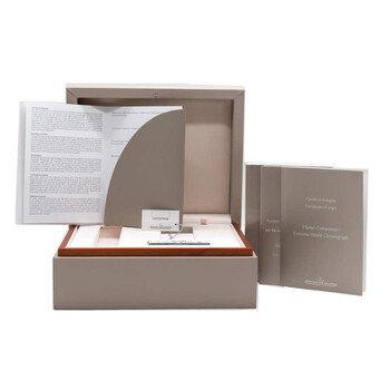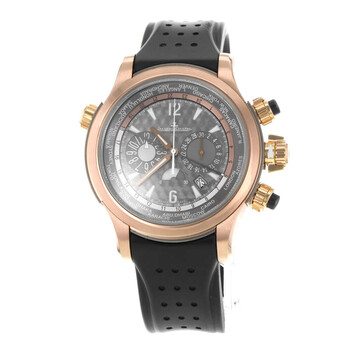 Rose gold-tone 18kt rose gold case with a black rubber strap. Fixed rose gold-tone 18kt rose gold bezel. Grey dial with rose gold-tone hands and index hour markers. Minute markers around the outer rim. Dial Type: Analog. Luminescent hands and markers. Date display between 4 and 5 o'clock position. Automatic movement. Scratch resistant sapphire crystal. Round case shape, case size: 46 mm. Buckle clasp. Functions: chronograph, date, hour, minute, second. Master Compressor Series. Luxury watch style. Watch label: Swiss Made. Pre-owned Jaeger-LeCoultre Master Compressor Chronograph Automatic Grey Dial Men's Watch 150.2.22.