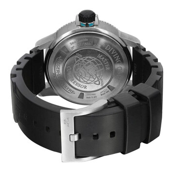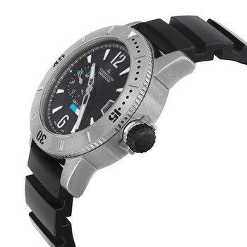 Grey titanium case with a black rubber strap. Uni-directional rotating grey titanium bezel. Black dial with silver-tone hands and index hour markers. Minute markers around the outer rim. Dial Type: Analog. Luminescent hands and markers. Date display at the 3 o'clock position. One subdial displaying: 24 hour. Jaeger LeCoultre Calibre JLC 975D Automatic movement, containing 29 Jewels, bitting at 28800 vph, and has a power reserve of approximately 48 hours. Scratch resistant sapphire crystal. Screw down crown. Solid case back. Round case shape, case size: 44 mm, case thickness: 16 mm. Band width: 22 mm, band length: 7.5 inches. Buckle clasp. Water resistant at 100 meters / 330 feet. Functions: date, GMT, second time zone, hour, minute, second. Master Compressor Series. Dive watch style. Watch label: Swiss Made. Item Variations: Q187T670, 187T670, 187.T6.70, Q187.T6.70. Pre-owned Jaeger-LeCoultre Master Compressor GMT Automatic Black Dial Men's Watch Q187T670.