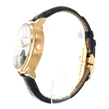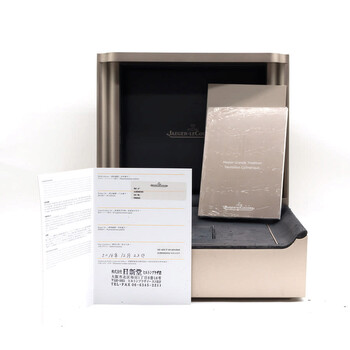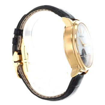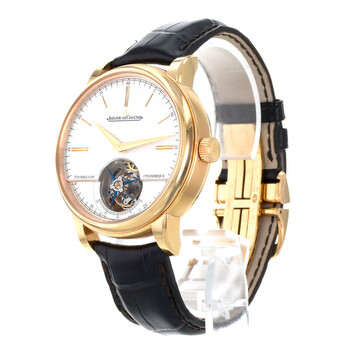 Rose gold-tone 18kt rose gold case with a leather strap. Fixed rose gold-tone 18kt rose gold bezel. Silver-tone dial with rose gold-tone hands and index hour markers. Minute markers around the outer rim. Dial Type: Analog. One subdial displaying: tourbillon. Jaeger LeCoultre Calibre JLC 995 Automatic movement, containing 31 Jewels, bitting at 28800 vph, and has a power reserve of approximately 45 hours. Scratch resistant sapphire crystal. Round case shape, case size: 42 mm. Fold over clasp with a safety release. Water resistant at 50 meters / 165 feet. Functions: hour, minute, cylindrical tourbillon. Master Grande Tradition Series. Luxury watch style. Watch label: Swiss Made. Item Variations: 186.2.F5.S. Pre-owned Jaeger-LeCoultre Master Grande Tradition Tourbillon Automatic Silver Dial Men's Watch Q5082420.