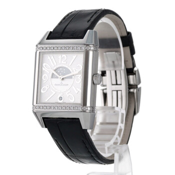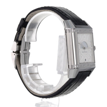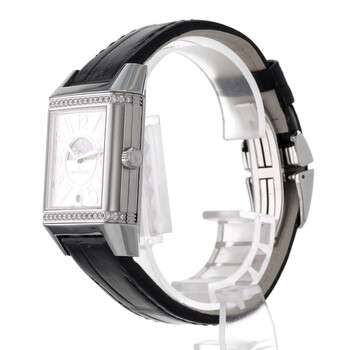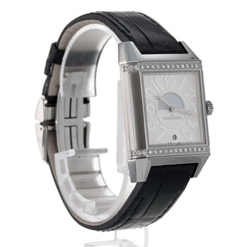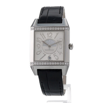 Silver-tone stainless steel case with a black leather strap. Fixed silver-tone bezel with diamond set stainless steel. White dial with silver-tone hands and Arabic numeral hour markers. Dial Type: Analog. Date display at the 6 o'clock position. Jaeger LeCoultre Calibre JLC 968 Automatic movement, containing 28 Jewels, composed of 207 parts, bitting at 28800 vph, and has a power reserve of approximately 38 hours. Scratch resistant sapphire crystal. Pull / push crown. Solid case back. Rectangle case shape, case size: 42 mm. Fold over clasp with a safety release. Water resistant at 50 meters / 165 feet. Functions: hour, minute. Reverso Squadra Lady Duetto Series. Luxury watch style. Watch label: Swiss Made. Item Variations: 235.8.76, Q7058420, 7058420, 705.84.20, Q705.84.20. Pre-owned Jaeger-LeCoultre Reverso Squadra Lady Duetto Automatic Diamond White Dial Ladies Watch Q7058420.