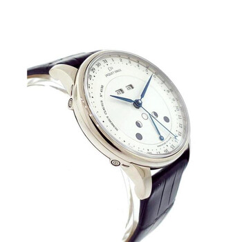 18kt white gold case with a black alligator band. Fixed white 18kt white gold bezel. White dial with blue hands and index hour markers. Date display and minute markers around the outer rim. Dial Type: Analog. Day and month at the 12 o'clock position. Moon phase subdials. Jaquet Droz Calibre 6553.4 automatic movement with a 72-hour power reserve. Scratch resistant sapphire crystal. Pull / push crown. Transparent case back. Round case shape, case size: 40.5 mm, case thickness: 12 mm. Band width: 22 mm. Buckle clasp. Water resistant at 30 meters / 100 feet. Functions: calendar, date, day, month, moon-phase, water resistant. Luxury watch style. Watch label: Swiss Made. Pre-owned Jaquet Droz Les Lunes Hommage Geneve 1784 Automatic White Dial Men's Watch J0126. Box: No ,Paper: Yes