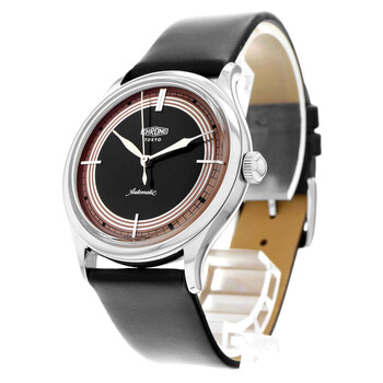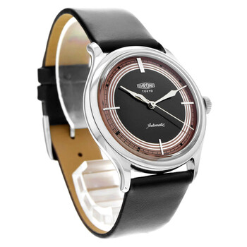 Silver-tone stainless steel case with a black leather strap. Fixed silver-tone stainless steel bezel. Brown dial with silver-tone hands and index hour markers. Minute markers around the outer rim. Dial Type: Analog. Luminescent hands and markers. Automatic movement. Solid case back. Round case shape, case size: 36 mm. Buckle clasp. Functions: hour, minute, second. Tokio Classic Series. Luxury watch style. Watch label: Swiss Made. Pre-owned Kurono Tokio Classic Automatic Brown Dial Men's Watch CT003P.