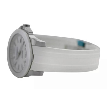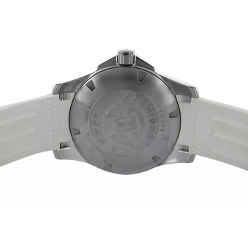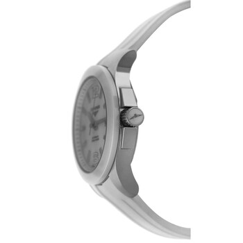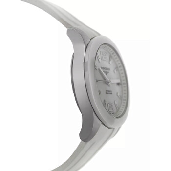 Silver-tone stainless steel case with a white rubber strap. Fixed white ceramic bezel. White dial with silver-tone hands and Arabic numeral & index hour markers. Minute markers around the outer rim. Dial Type: Analog. Luminescent hands and markers. Date display at the 3 o'clock position. Quartz movement. Scratch resistant sapphire crystal. Pull / push crown. Solid case back. Round case shape, case size: 39 mm. Deployment with push button release clasp. Water resistant at 300 meters / 1000 feet. Functions: date, hour, minute, second. Conquest Series. Dive watch style. Watch label: Swiss Made. Item Variations: L3.655.4. Pre-owned Longines Conquest Quartz White Dial Ladies Watch L3.655.4.86.2.