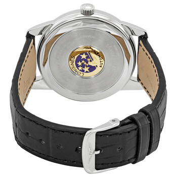 Stainless steel case with a black (alligator) leather strap. Fixed stainless steel bezel. Silver dial with yellow gold-tone dauphine-style hands and index hour markers. Minute markers around an inner ring. Dial Type: Analog. Date display at the 12 o'clock position. Longines calibre L633 automatic movement, based upon ETA 2824-2, containing 25 Jewels, bitting at 28800 vph, and has a power reserve of approximately 38 hours. Scratch resistant sapphire crystal. Pull / push crown. Solid case back. Round case shape. Case size: 40 mm. Case thickness: 10.5 mm. Band width: 20 mm. Tang clasp. Water resistant at 30 meters / 100 feet. Functions: date, hour, minute, second. Heritage Series. Casual watch style. Watch label: Swiss Made. Item Variations: L1 645 4 75 4, L1-645-4-75-4, L1/645/4/75/4, L16454754. Longines Heritage Automatic Silver Dial Men's Watch L1.645.4.75.4.
