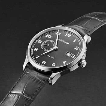 Pre-owned Silver-tone stainless steel case with a grey leather strap. Fixed silver-tone stainless steel bezel. Grey dial with silver-tone hands and Arabic numeral hour markers. Minute markers around the outer rim. Dial Type: Analog. Date display at the 3 o'clock position. Automatic movement. Scratch resistant sapphire crystal. Pull / push crown. Transparent case back. Round case shape, case size: 40 mm, case thickness: 11 mm. Band width: 20 mm, band length: 8 inches. Fold over clasp with a safety release. Water resistant at 50 meters / 165 feet. Functions: date, hour, minute, second. Additional Info: hours, minutes, small seconds, date. 1931 Series. Luxury watch style. Louis Erard 1931 Automatic Grey Dial Men's Watch 66226AA23.BDC85.