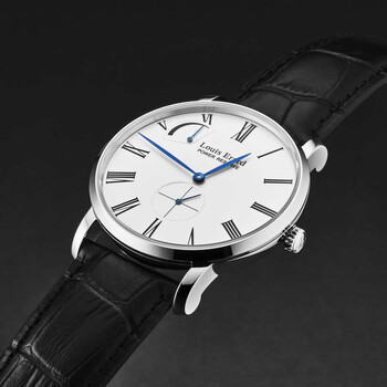 Pre-owned Silver-tone stainless steel case with a black leather strap. Fixed silver-tone stainless steel bezel. Silver-tone dial with blue hands and Roman numeral hour markers. Dial Type: Analog. Hand wind movement. Scratch resistant sapphire crystal. Pull / push crown. Solid case back. Round case shape, case size: 40 mm, case thickness: 9 mm. Band width: 21 mm, band length: 8 inches. Deployment with push button release clasp. Water resistant at 50 meters / 165 feet. Functions: hour, minute, second. Additional Info: hours, minutes, small seconds, power reserve. Excellence Series. Luxury watch style. Watch label: Swiss Made. Louis Erard Excellence Hand Wind Silver Dial Men's Watch 53230AA11.BDC02.