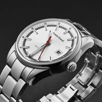 Pre-owned Silver-tone stainless steel case and bracelet. Fixed silver-tone stainless steel bezel. Silver-tone dial with silver-tone hands and index hour markers. Minute markers around the outer rim. Dial Type: Analog. Luminescent hands and markers. Date display at the 3 o'clock position. Automatic movement. Scratch resistant sapphire crystal. Pull / push crown. Solid case back. Round case shape, case size: 40 mm, case thickness: 11 mm. Band width: 20 mm, band length: 8 inches. Deployment with push button release clasp. Water resistant at 50 meters / 165 feet. Functions: date, hour, minute, second. Additional Info: hours, minutes, seconds, date. Heritage Series. Luxury watch style. Watch label: Swiss Made. Louis Erard Heritage Automatic Silver Dial Men's Watch 69105AA11.BMA19.