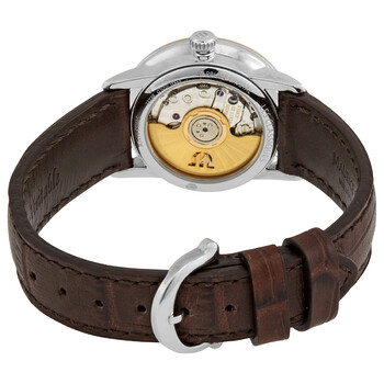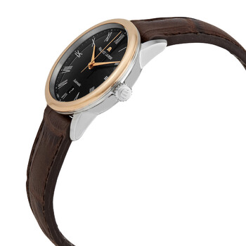 Silver-tone stainless steel case with a brown (crocodile) leather strap. Fixed 18kt rose gold bezel. Black dial with rose gold-tone hands and Roman numeral hour markers. Minute markers around the outer rim. Dial Type: Analog. Date display at the 6 o'clock position. Maurice Lacroix Calibre ML 155 Automatic movement, containing 25 Jewels, bitting at 28800 vph, and has a power reserve of approximately 38 hours. Scratch resistant sapphire crystal. Pull / push crown. Transparent case back. Round case shape, case size: 28 mm, case thickness: 9 mm. Band width: 15 mm. Tang clasp. Water resistant at 30 meters / 100 feet. Functions: date, hour, minute, second. Les Classiques Series. Luxury watch style. Watch label: Swiss Made. Pre-owned Maurice Lacroix Les Classiques Automatic Black Dial Ladies Watch LC6063-PS101-310.