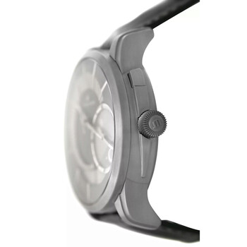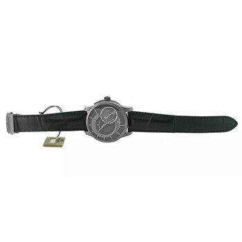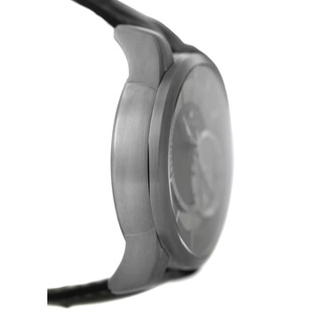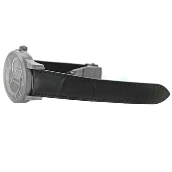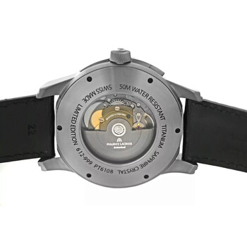 Black titanium case with a black leather strap. Fixed black titanium bezel. Grey dial with silver-tone hands and Arabic numeral & index hour markers. Dial Type: Analog. Date display at the 6 o'clock position. Two sub-dials displaying: 12 hour, day/night indicator. Maurice Lacroix Calibre ML 121 Automatic movement, containing 30 Jewels, bitting at 28800 vph, and has a power reserve of approximately 40 hours. Scratch resistant sapphire crystal. Pull / push crown. Transparent see through case back. Round case shape, case size: 44 mm. Deployment with push button release clasp. Water resistant at 50 meters / 165 feet. Functions: date, GMT, second time zone, hour, minute, second, day/night indicator. Pontos Decentrique Gmt Series. Luxury watch style. Watch label: Swiss Made. Item Variations: PT6108, PT6108 TT031 291, PT6108.TT031.291, PT6108TT031291. Pre-owned Maurice Lacroix Pontos Decentrique Gmt GMT Automatic Day-Night Grey Dial Men's Watch PT6108-TT031-291.