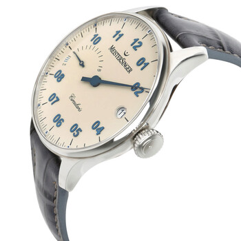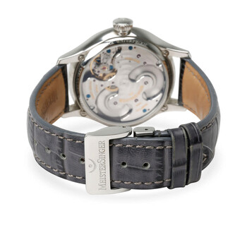 Silver-tone stainless steel case with a leather strap. Fixed silver-tone bezel. White dial with blue hands and Arabic numeral hour markers. Minute markers around the outer rim. Dial Type: Analog. Date display at the 3 o'clock position. Hand wind movement. Scratch resistant sapphire crystal. Transparent case back. Round case shape, case size: 42 mm, case thickness: 12 mm. Band length: 8.50 inches. Buckle clasp. Functions: date, hour, minute, second. Sport watch style. Pre-owned MeisterSinger Circularis Hand Wind White Dial Men's Watch CCP303.